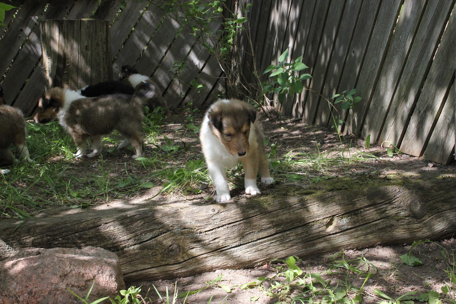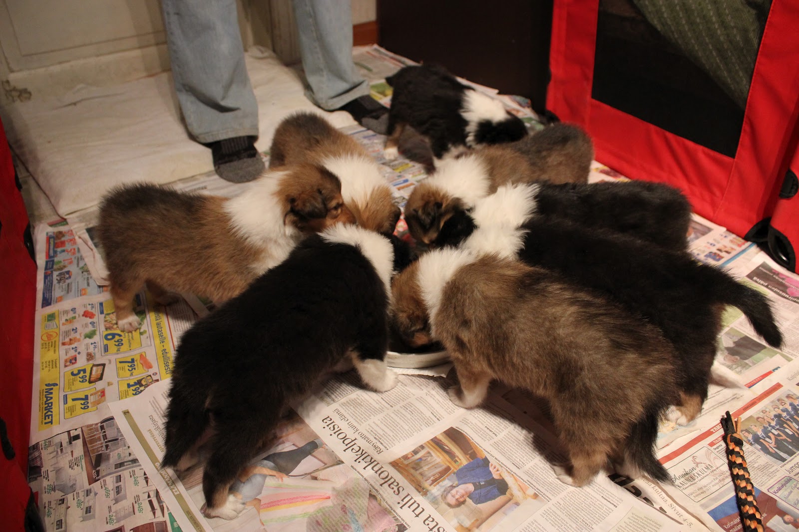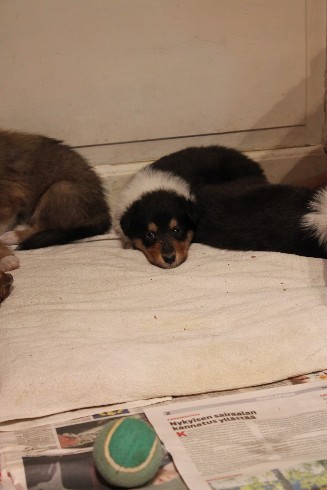 Viime viikonloppuna suunnattiin siis Anjalaan tarkemmin inkeroiseen katsomaan ensimmäistä kertaa pikkuisia pentuja livenä :) Matka sujui nopeasti ja löydettiin helposti perille. Vastassa oli komea haukku kuoro kun Pina (emä) ja kaksi muuta Anjan nahkaa (Steppi & Tellu) ilmoittivat saapuvista vieraista. Emäntä itse odotteli rappusilla :) Kiireen vilkkaa mentiin sisälle katsomaan pentuja, jotka olivat hieman väsähtäneitä, kun oli jo kertaalleen ulkoilleet. kyllä ne silti sieltä jaksoivat möngertää mooikkaamaan. Oli ihana pitää pientä hauva vauvaa sylissä <3 Ekana tietenkin katsastettiin soopeli pojat, ja pidettiin sylissä niitä hetki. porukka olisi halunnut vain nukkua joten Anja toi velliä pennuille ja sehän maistui vauvoille hyvin. Toinen soopeli pojista oli todella ahne ja ollut kuulemma koko ajan ja jälkeenpäin vähän köhittiin velliä :) Otettiin pojat eri huoneeseen että pysyi tarkastelemaan niitä ja selvä erohan näissä oli ainakin tällä kertaa oli Alastair rauhallinen ja taas Amery villisti leikki ja puri sormia :) siinä se päätös olikin Amery tulee meille. Harmitti kovasti kyllä kun olisin halunnut Maaritin tulevan katsomaan pentuja, ja kuulla mielipiteen mutta silloin ei sopinut.Maarit oli kyllä käynyt oliko maanantaina ja anja ilmoitti että oikea pentu on valittu meille : Vietiin pojat takaisin aitaukseen ja jonkin ajan kuluttua otettiin pari palloa kainaloon ja vietiin ulos. Kovasti oli vipinää ja vilskettä, osaa hyvin jo tehdä ulos kakat ja pissat ja kiipeilee ja painii, vähän maisteltiin lehtiäkin.. Lopuksi päästettiin Pina mamma moikkaamaan vauvojaan ja Pina taisi olla sitä mieltä että vieraat olisi ollut kivempia kun saa rapsuja kun naskalihampaiset pennut tisseissä roikkumassa!. Tämän jälkeen vietiinkin pennut jo takaisin sisään ja alettiin valmistautua kotiin lähtöön. Lauantaina uudestaan katsomaan miten ne on nyt kasvaneet. Tässä vielä vauvoista kuvia pennuilla ikää näissä 4vkoa :)
