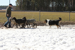 Ekan ja tokan kierroksen välissä vaihtui lampaat ja näissä uusissa lampaissa oli mukana hiukan erilainen lammas. Ihmettelin kun Jedi nuuski sen takapuolta ja lammas vain pysähtyi eikä hakeutunut laumaansa ja saattoi vain uhkaavasti tuijotella koiraa vaikka koira haukkui, mutta ilmeisesti lampaalla oli alkamassa kiima tai oli. Se hiukan "pilasi" varsinkin viimisen kierroksen, jossa loppu vaiheessa Jedi kulki kuono Lampaan pyllyssä x) mutta hienosti se meni kokonaisuudessaan. Jedi innostui lampaista, ei juossut läpi vaan enemmänkin pyöri lampaita ympäri ja jopa hieman kuljetti lampaita. Ajattelin siis ilmoittaa Jedi myös taippariin johon Roxykin on ilmottu kesäkuussa. 5.5 on taas paimennus jedillä katsotaan miten sitten menee. Olen kyllä todella ylpeä Roxyn pennuista jotka tajusivat heti homman ja oli innokkaita paimenia, ja selvästi Roxy periyttää tätä ominaisuuttaan koska Pina mamma ei niin ollut kiinnostunut lampaista, ainakaan tällä kertaa. kuvia vielä eilisestä ;